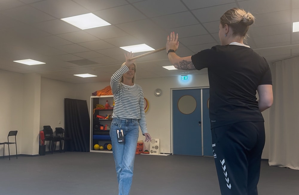 Voorbeeld van een PMT-oefening: leiden en volgen door middel van een stok. Aanvoelen wat de ander doet, vertrouwen op de ander. Ben je een leider en zou je ook de ander kunnen volgen? Of juist oefenen met de leiding nemen. Dat zijn voorbeelden van thema’s die je aantikt met de oefening. Het is de bedoeling dat je door de ruimte heeft beweegt met de stok tussen beide handen en op die manier samenwerkt.